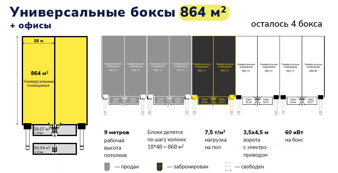 Блоки от 990 м2, в том числе офис с готовым ремонтом 120м2. На блок 1 ворота с электро приводом. Высота потока 9м, нагрузка на пот до 7тн/м2, антипыль. Эл.мощность 53 кВт. На этапе строительства можно учесть индивидуальные потребности к помещению.
