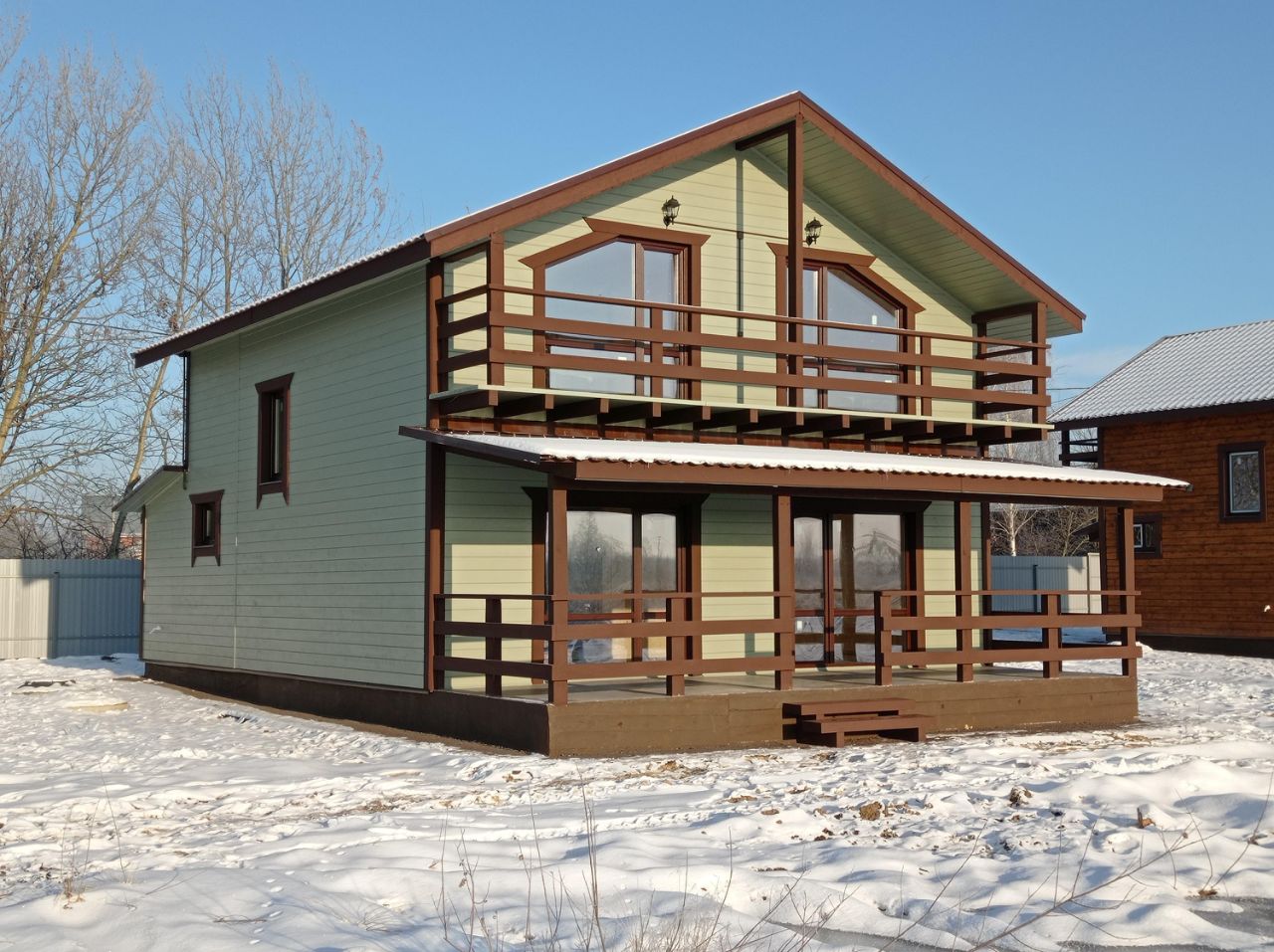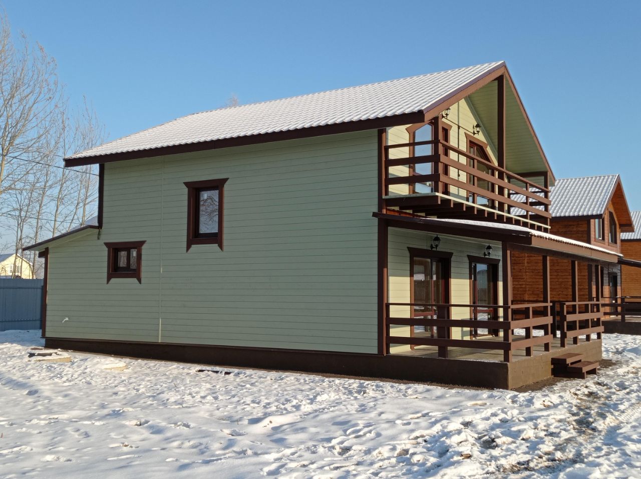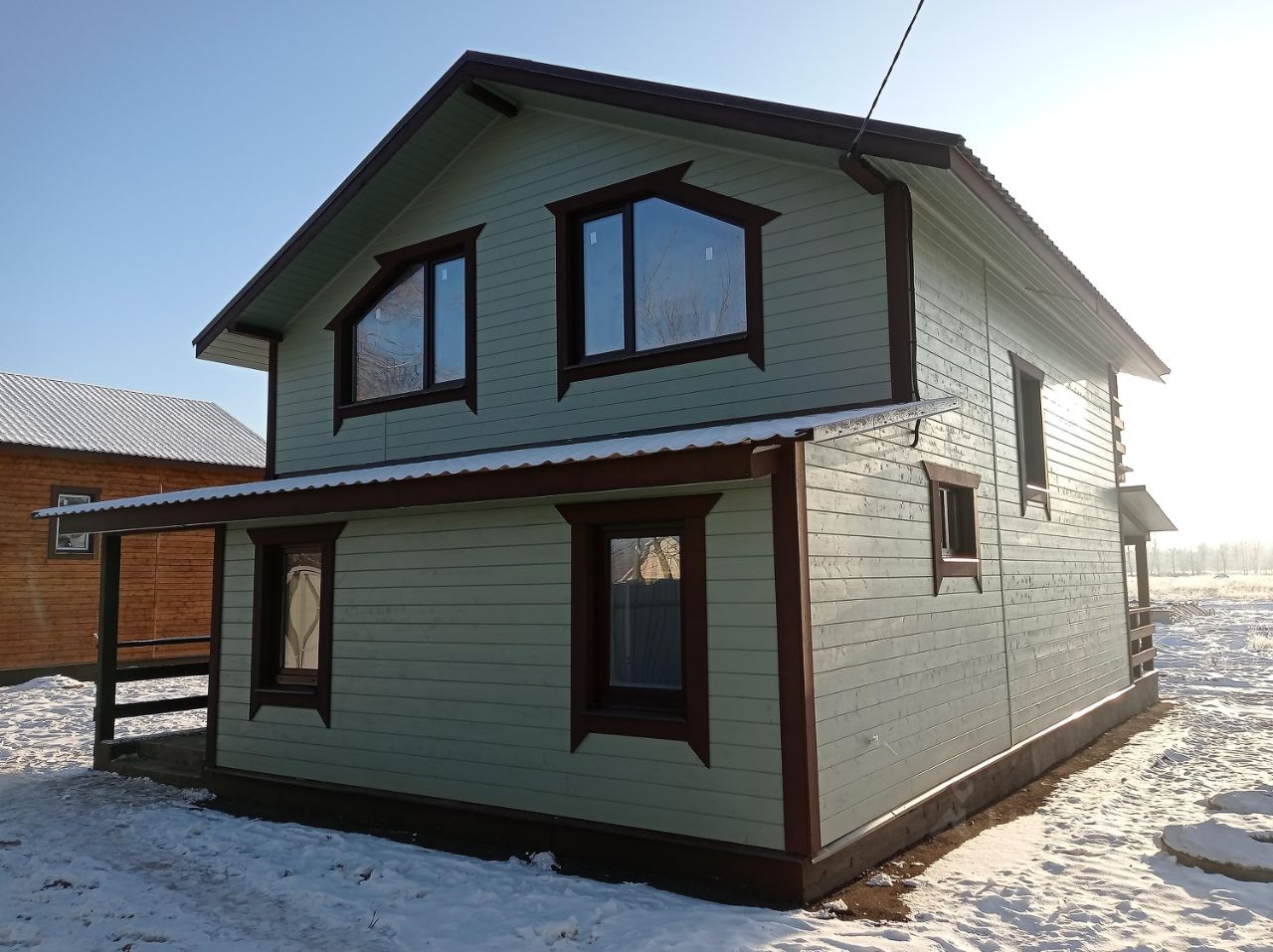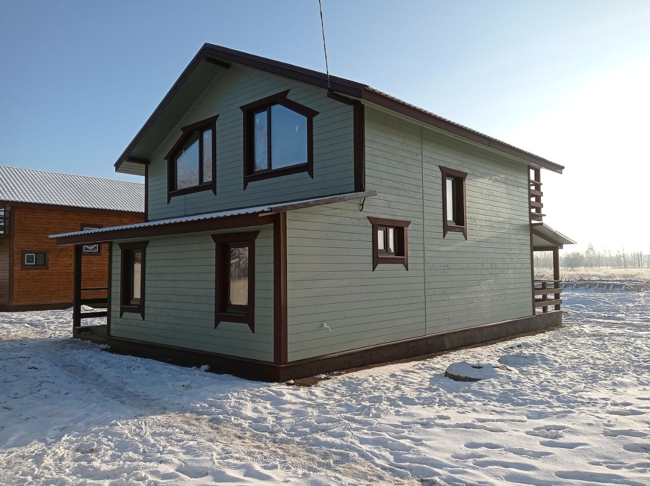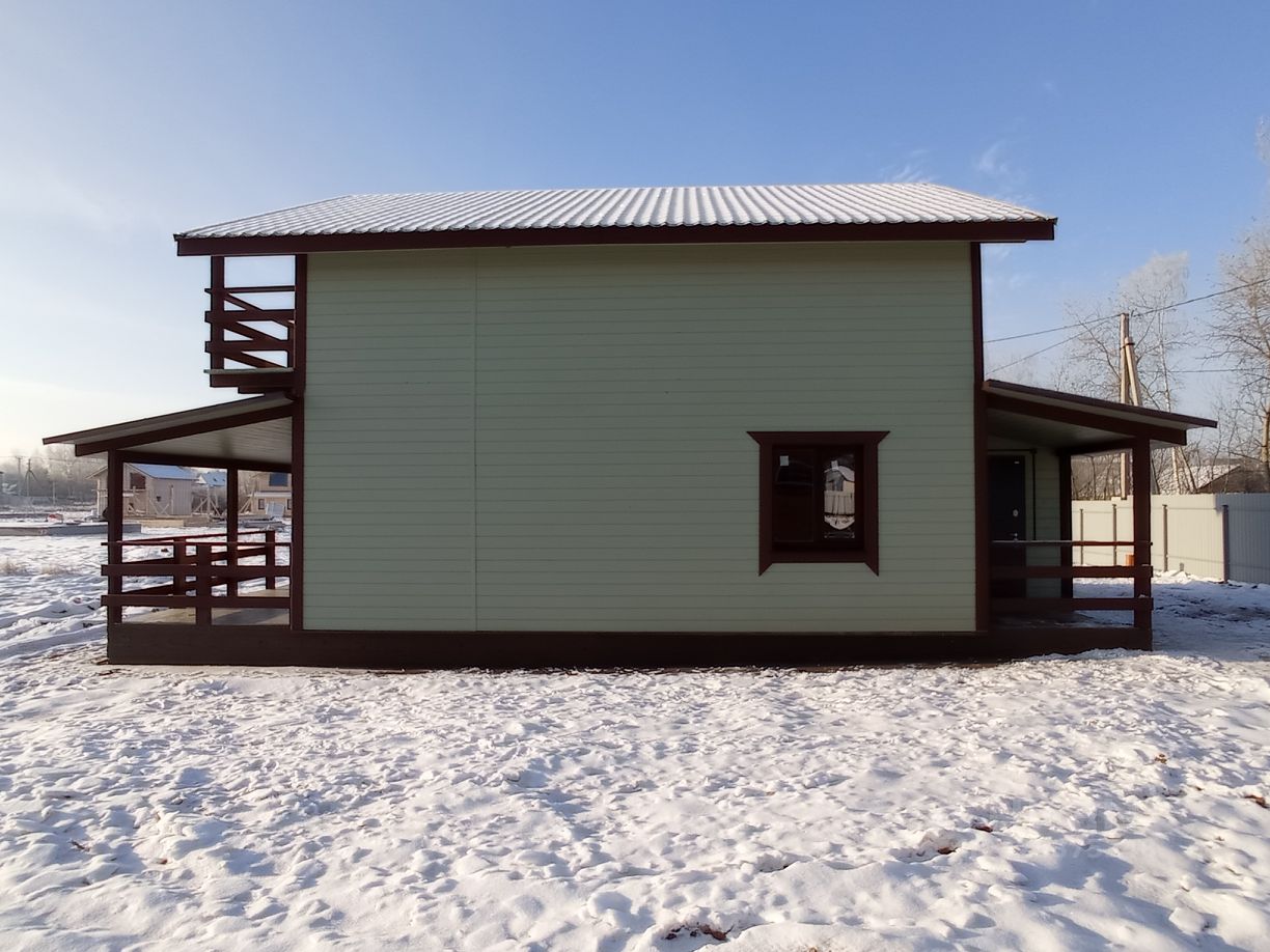 — Площадь дома 105 м², — Стены из бруса 100 на 150, (утепление, обшивка имитация бруса) — Электричество 15 кВт. — Горячее холодное водоснабжение (скважина, электрический котёл) — Фундамент ленточный с укладкой плиты теплого пола по всему первому этажу, — Высота потолков 2,7 метра, — Отделка стен деревом под покраску, — Установлены межкомнатные двери, — Уложен керамогранит в санузлах, установлена сантехника, — Смонтированы натяжные потолки, — Утепленная кровля с металлочерепицей, — Эргономичная планировка, — Канализация - септик КИТ,